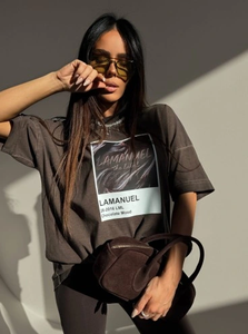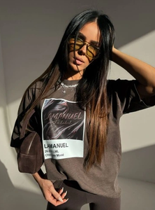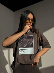Oversize’owy T-shirt handmade z grubej, konkretnej dzianiny robi robotę od pierwszego dotyku – cięższy, mięsisty materiał układa się perfekcyjnie, nie przylega, tylko tworzy sylwetkę z charakterem, a centralna grafika wygląda jak kolekcjonerski print z limitowanej wystawy: intensywna, błyszcząca faktura na tle przypominającym roztopioną czekoladę, z logotypem LAMANUEL wbitym jak podpis artysty – to nie jest zwykły T-shirt, to vibe, który od razu rzuca się w oczy i zostaje w głowie.
